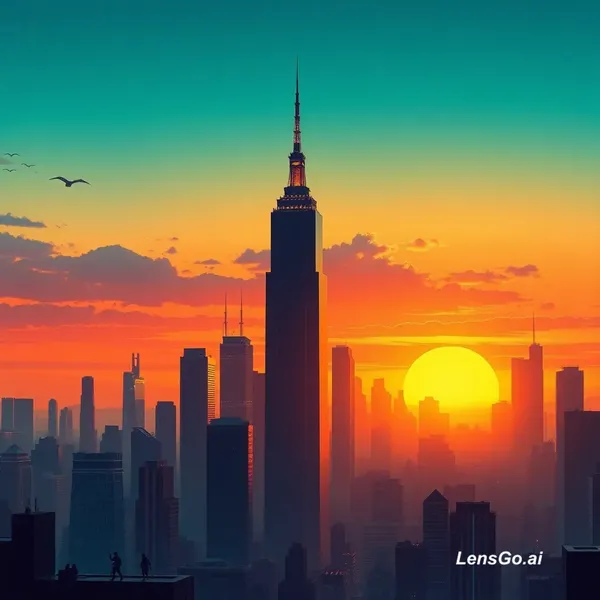 AI Image: Art deco poster of a futuristic city skyline at sunset