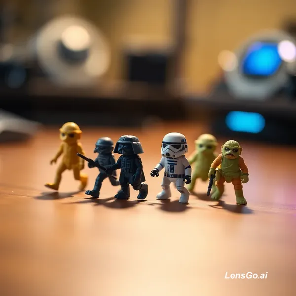 AI Image: Miniature Star Wars inspired creatures walking across a tabletop, tiny detailed figurines with soft