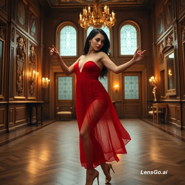 A spacious room in a luxurious Victorian palace offers a realistic, full-body view of a beautiful woman with a voluptuous and alluring figure, featuring wide hips, full thighs, a slender waist, and soft, feminine curves. Her body is characterized by a strong, broad physique, full hips, and an even fuller lower body. She has captivating blue eyes, smooth, radiant skin, and long, meticulously styled black hair. She performs a seductive dance, wearing a short, elegant, sheer, sleeveless red dress that accentuates her waist, hips, and thighs, creating a sophisticated and elegant look. The camera moves sideways around the slender woman as she dances, then smoothly rises to reveal her full, majestic form before tilting downwards in a captivating, dreamy shot of her moving to the rhythm of the music. The result is truly stunning. Exquisite detail, incredibly realistic cinematic lighting, anamorphic lens effects, fine film grain, warm colors (gold, turquoise, amber, deep red), and a captivating, mysterious atmosphere-all in breathtaking 8K resolution at 32kHz.