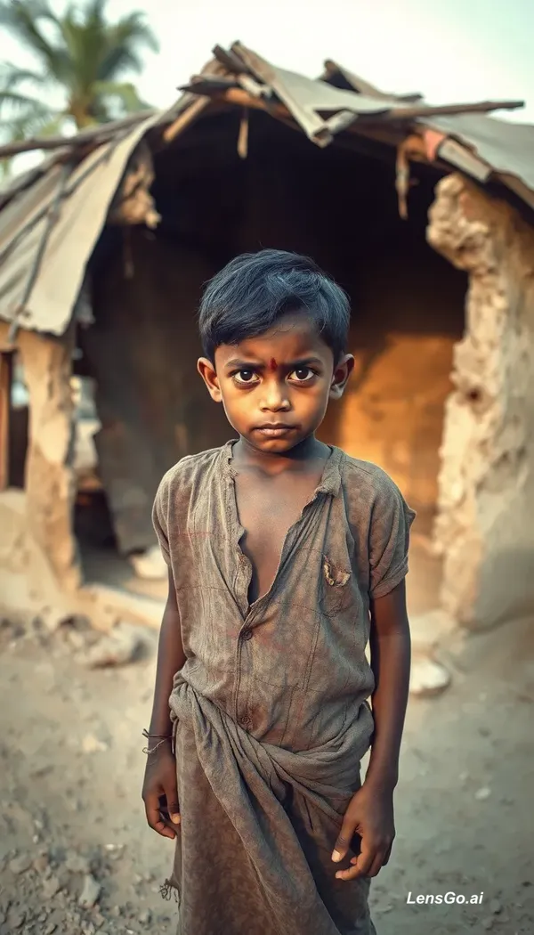 A poor Indian boy around 10 years old wearing torn clothes, standing outside a small broken hut, dusty environment, sad face, realistic lighting, rural India, emotional mood, ultra realistic, 4k