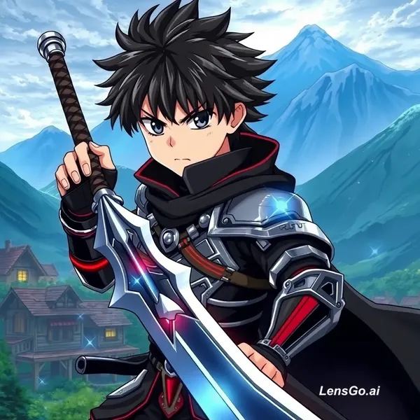 anime hero boy, powerful swordsman, black hair, determined eyes, wearing black and silver fantasy armor with red glowing lines, holding a large magical sword emitting blue energy, heroic pose, anime style, fantasy background village and mountains, dramatic lighting, shonen anime style
