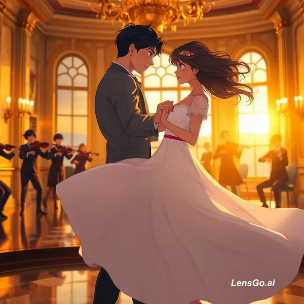 AI Image: masterpiece, best quality, romantic anime cinematic scene, waltz dance, couple spinning gracefully,