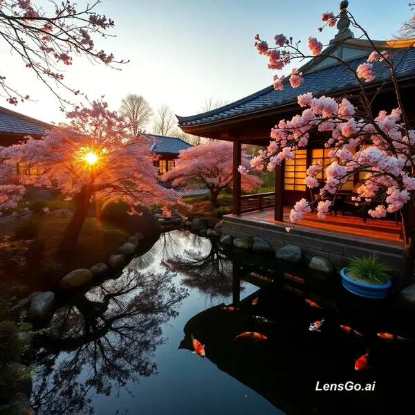 AI Image: A serene Japanese garden at golden hour, koi pond reflecting cherry blossoms