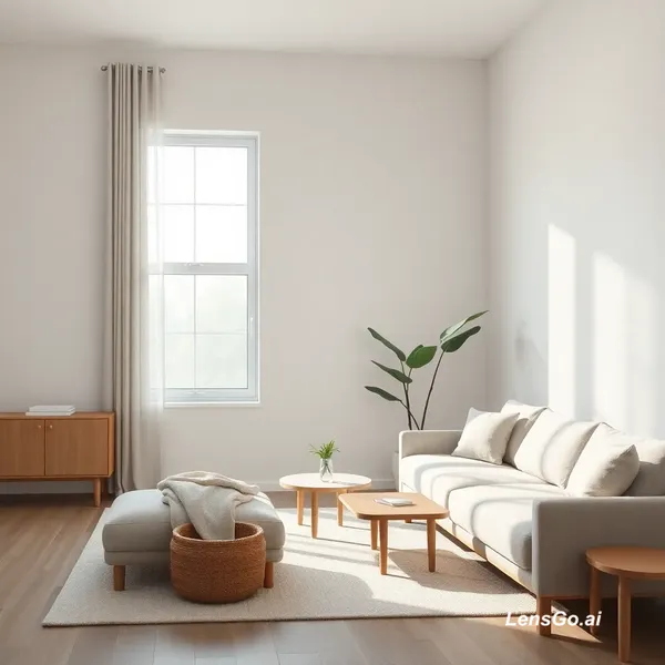 AI Image: Photorealistic interior of a Scandinavian minimalist living room, neutral linen tones, oak wood furn