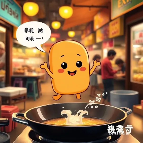 cute animated mackerel fish cracker character, single crispy cracker piece with cute face, small arms and legs, funny walking style, standing in a lively Thai street market, warm lighting, colorful stalls the character speaks Thai language clearly: "ฉันเป็นข้าวเกรียบปลาทู ทำจากปลาทูแท้ๆ" camera slowly zoom in, character waves hands happily, cheerful expression then continues: "พอเอาไปทอด" scene smoothly transitions into a hot frying pan with bubbling oil, the cracker jumps into the pan, oil splashing slightly, dramatic lighting the cracker expands and becomes golden crispy, glowing texture final line: "ก็กรอบอร่อยจนต้องยิ้มเลย" anime style, cinematic motion, smooth animation, high detail, cute and funny, dynamic lighting