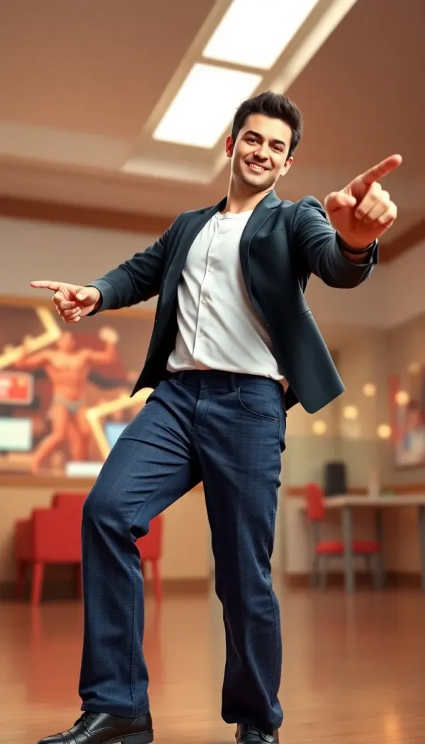 AI Image: confident man dancing like bully maguire, finger guns, exaggerated swagger, funny meme energy, full