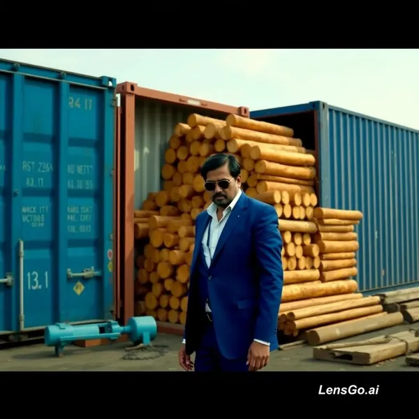 Video mein jo baatein ho rahi hain aur jo scenes hain, unka pura detail ye raha: Scene 1: Port par Container Girna Visual: Ek bada container niche girta hai aur usme se bahut saari lakdiyaan (logs) nikal kar phail jaati hain. Worker 1: (Bhagte hue aata hai) "India se aaye is container ke andar itni saari lakdiyaan..." Worker 2: "Hain? Iska sender kaun hai?" Worker 1: "Pata nahi, naam nahi likha hai." Scene 2: Gangster ki Entry Visual: Char kaali gaadiyan aati hain. Ek aadmi blue suit aur sunglasses mein bahar nikalta hai (Don jaisa look). Don (Blue Suit): "Maine toh koi lakdiyaan nahi mangwayi thi, toh ye sab kya hai?" Worker: "Hume bhi theek se pata nahi hai sir." Don: "Is container par kya likha hai?" Worker: "VASHUBHU... (shayad 'Bashubhu' bol raha hai)" Don: "Bashubhu?" Worker: "Ji, aisa hi lag raha hai." Scene 3: Action & Phone Call Visual: Don drink leta hai. Tabhi uske aadmi ek dusre aadmi ko rassi se baandh kar latka dete hain. Don ke paas ek purana blue phone bajta hai. Don: (Phone uthata hai aur sunta hai...)