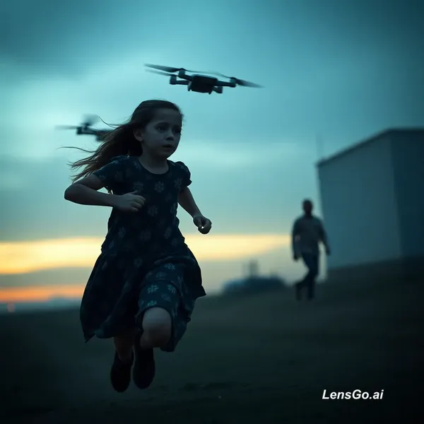 AI Image: Girl running away during war zoom out via drone