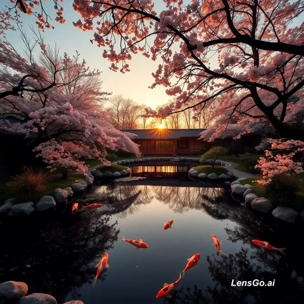 AI Image: A serene Japanese garden at golden hour, koi pond reflecting cherry blossoms