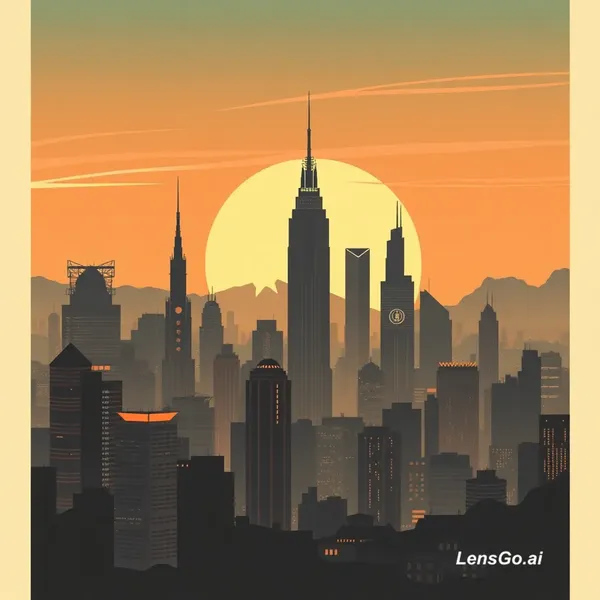 AI Image: Art deco poster of a futuristic city skyline at sunset