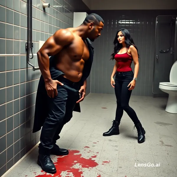 Hombre negro musculoso en boxer, piernas descubiertas, esta montado encima de chica rubia vampira, vestida en chaqueta de cuero negra, pantalon de jeans negro, correa blanca, negras botas, tirada en el piso sucio de un baño publico, con la boca abierta, el hombre negro musculoso en boxer esta mirando de frente a una chica rubia vampira, el hombre negro tiene sus piernas encima de las caderas de la chica rubia vampira