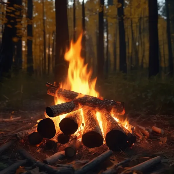 AI Image: A beautiful campfire burning brightly in the dark forest, orange and yellow flames dancing, wood cra