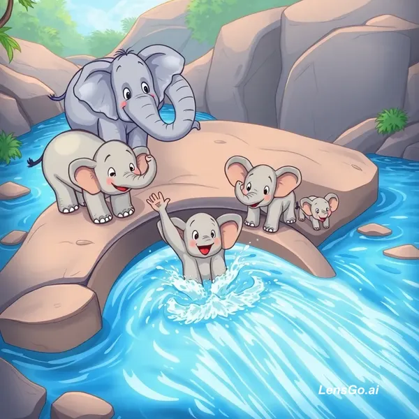 AI Image: "A vibrant cartoon of a happy elephant family crossing a river using a natural waterslide. The famil