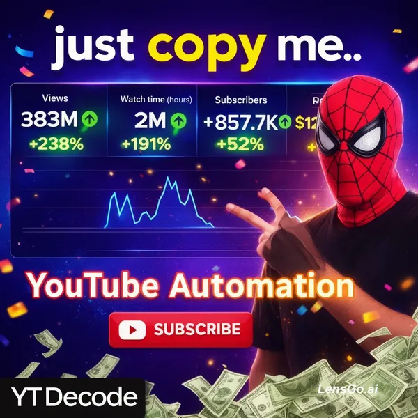 Edit my uploaded image: 1. Replace the man's face with a red superhero-style spider mask (NOT Spider-Man). 2. Slightly reduce overall color saturation. 3. Add dollar cash graphics at the bottom. 4. Write text: "YouTube Automation". 5. Add channel name "YT Decode" in the bottom-left corner. 6. Keep thumbnail style clean and professional.