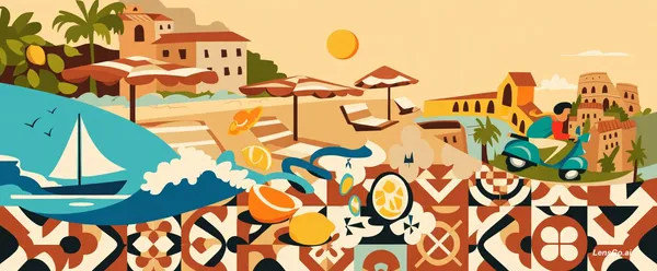 colourise the first sketch image. The illustration style is modern retro-minimalism, with geometric forms and sharp angles, flat vector aesthetic and colour blocking. The concept is Italian summer so the colours should be more warm. illustration is a beach front with umbrellas with the background of italian houses, below is a sailboat with a wave on the foreground. beside it is an orange peel on an italian tile pattern, on its right is a guy on a vespa with the background of Venice bridge, italian houses, trees and on the right is the colosseum.