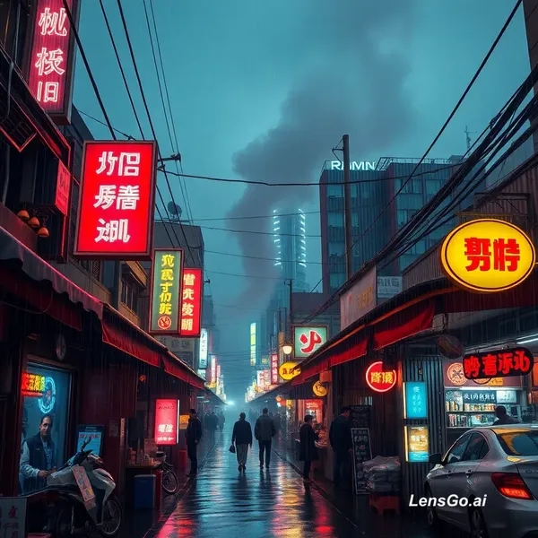 AI Image: Cyberpunk street market in the rain, neon signs and steam rising