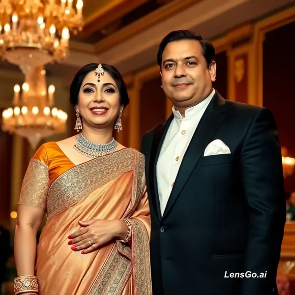 AI Image: A luxurious portrait of Mukesh Ambani and Nita Ambani standing together at a grand event, Mukesh Amb