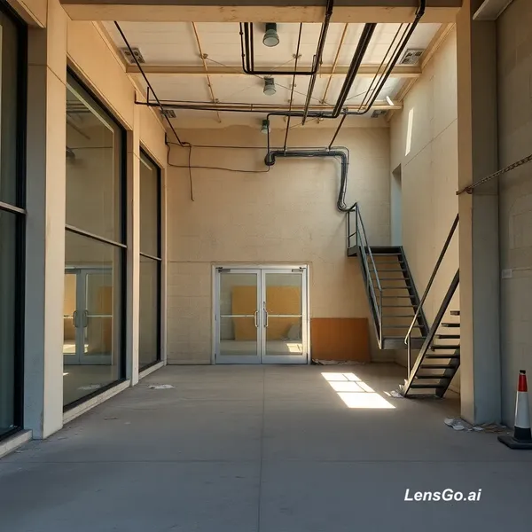 SCENE LOCK: Static tripod from across the street at eye level 1.6m height, natural 35mm lens feel, centered framing capturing full glass storefront, interior depth, and upper mezzanine. Bright daylight consistent throughout all stages. Fixed landmarks: full-height glass storefront with double pivot doors, central structural column 3m inside, concrete staircase on right wall, rear wall centered for future LED wall, ceiling grid lines visible. STAGE: Neglected vacant retail shell, dusty concrete floor, exposed wiring hanging from ceiling grid, cracked drywall sections, temporary plywood covering parts of glass, faded exterior signage removed leaving ghost marks. DETAILS: Dirt buildup in window corners, old tape residue on glass, debris piles near structural column, sunlight casting sharp shadows through storefront glass, faint footprints in dust, small safety cones near exposed wiring, uneven wall patches. NEGATIVE: no text, no logos, no watermarks, no warped geometry, no new doors or windows, no floa