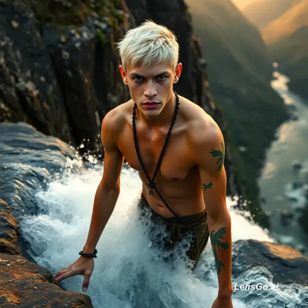 twenty-one year old tribal man; pale hair; pale complexion; angry expression; tropical mountain clothing; warrior tattoos; on mountain overlooking rocky cliff with river below. Steps into a waterfall and stands as it rushes over him just before dawn.