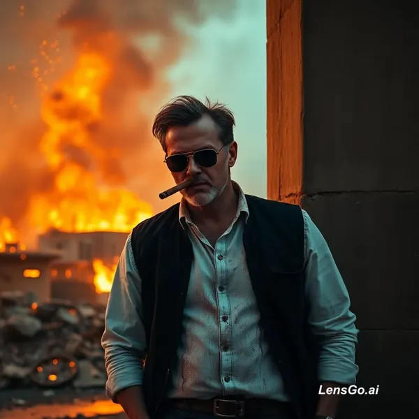 A cinematic slow-motion video of a serious man wearing a black vest, white dirty shirt and sunglasses, leaning against a broken concrete pillar in a burning city. He is smoking a cigar calmly while fire and explosions burn in the background. Sparks and embers floating in the air. Dramatic orange and blue lighting, intense atmosphere. The camera slowly pushes in toward his face, slight wind moving his hair and shirt. Fire flickering behind him, smoke moving naturally. Ultra-realistic, 4K, shallow