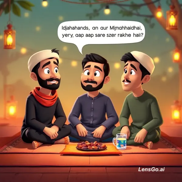 Create a short 3D cartoon scene in Pixar/Disney style. Three Muslim friends are sitting on a mat in a peaceful Ramadan evening environment with soft lantern lights. Dates and water are on a small mat. Shahid looks at his two friends and asks in a friendly tone: “Ijaz bhai aur Mujahid bhai, kya aap ne saare roze rakhe hain?” Style: Cinematic lighting, warm Ramadan vibe, expressive animated faces, friendly atmosphere, no text on screen.