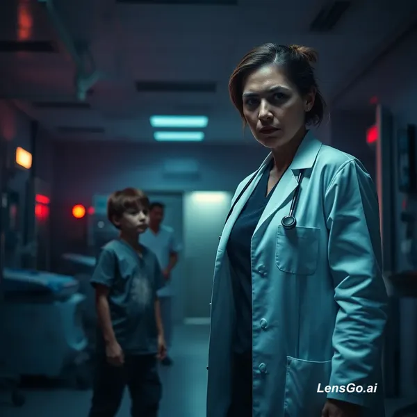inside a hospital ICU at night, a senior female doctor in white coat angrily stepping forward toward a young boy in torn dirty clothes, sharp intense expression on her face, brows furrowed, hand slightly raised as if to stop or scold, other staff watching in background, medical machines glowing nearby, cold blue hospital lighting mixed with red emergency highlights, cinematic mid-shot with slight low angle to emphasize authority, shallow depth of field, high contrast shadows, ultra realistic, 4K, dramatic tense atmosphere