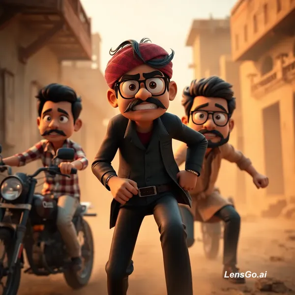 AI Image: 3D animated Indian comedy gangster movie, cinematic lighting, dramatic shadows, expressive cartoon c
