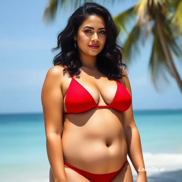 mujer con cuerpo físico corpulento curvilínea, con proporciones equilibradas, con un torso más estrecho y una cadera más ancha. Con piel tono uniforme, senos notablemente prominentes, con una forma redonda y un contorno bien definido. Su cabello es oscuro con pariencia general en bikini rojo