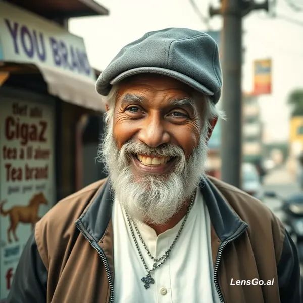 "A hyper-realistic, high-detail portrait of a 70-year-old Bangladeshi man with a thick, well-groomed white beard and bushy white eyebrows. He is wearing a stylish charcoal-grey flat cap (newsboy cap), a crisp white traditional panjabi, and a trendy bomber jacket with a silver zipper. He has a funny, mischievous facial expression, grinning wide to reveal a single prominent tooth sticking out from the side of his mouth. He is wearing layered silver chains with dadaZ pendant. Background: A blurry, authentic street in Dhaka with a traditional tea stall (tong), vintage posters written "you brand"with Bengali text (চুল বাতসে পাকে নাই) , and soft cinematic afternoon sunlight. Shot on 35mm film, 8k resolution, grainy texture, extremely realistic skin pores and fabric details."
