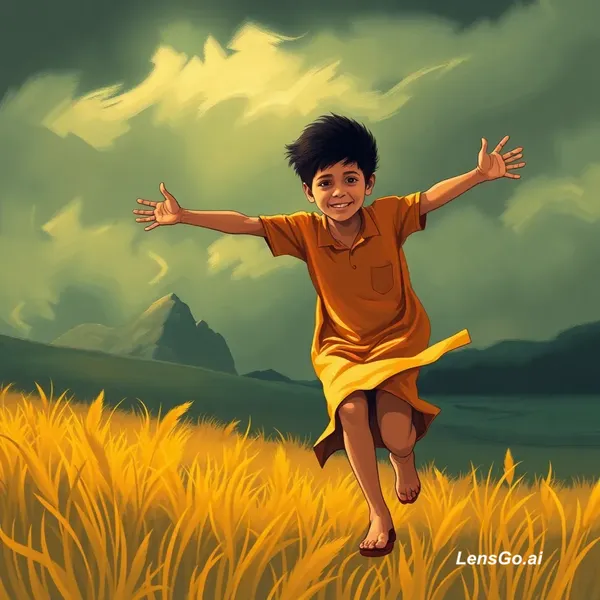In a small village surrounded by golden fields, there lived a boy named Ayaan. He had a strange dream—not of becoming rich or famous, but of catching the wind. Every day, he would run across the fields, arms stretched wide, laughing as the breeze rushed past him. The villagers would shake their heads. “You can’t catch the wind,” they’d say. But Ayaan never argued. He just smiled and ran faster. One evening, a powerful storm rolled in. The sky darkened, and the wind howled like a wild creature. While everyone hid inside, Ayaan stepped out. “This is it,” he whispered. He ran into the storm, heart pounding. The wind pushed against him, stronger than ever before. For the first time, he stopped running and stood still. And then he understood. The wind was never something to catch—it was something to feel. As the storm passed, Ayaan stood quietly, eyes closed, a soft smile on his face. From that day on, he no longer chased