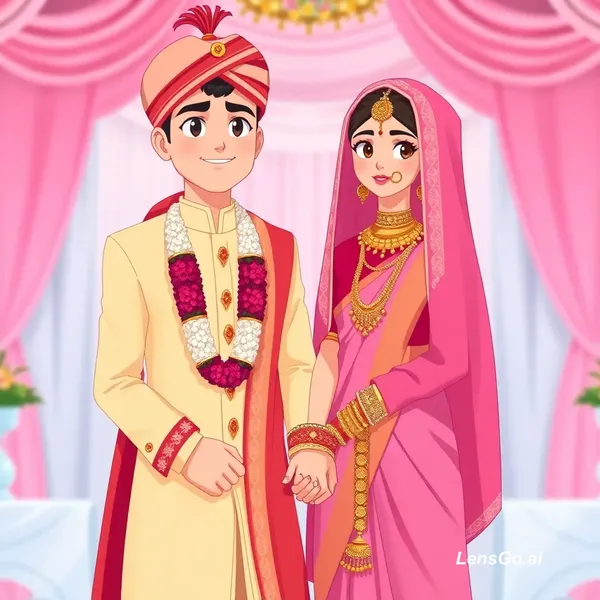 Anime-style illustration of an Indian wedding couple. Groom wearing a cream sherwani with a red turban and flower garland, bride wearing a bright pink saree with heavy gold jewelry and traditional nose ring. The couple is standing together holding hands with a soft pink decorated wedding background. Detailed anime art, soft lighting, vibrant colors, romantic wedding atmosphere, Studio Ghibli inspired style.
