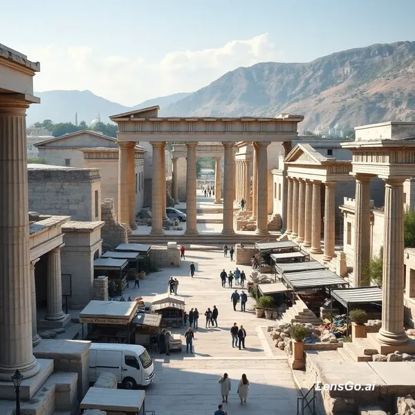 AI Image: ancient Greek city Stratonikeia, marble temples, ancient marketplace, cinematic historical atmospher