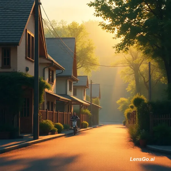 AI Image: cinematic village morning, soft sunlight rays, slow camera push-in, realistic animation, warm color