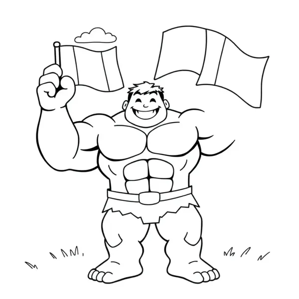 A simple black and white coloring page for kids of a big friendly superhero similar to Hulk, smiling and holding an Irish flag high in the air in one hand. The character should look strong but cartoonish and kid-friendly, with big muscles and a happy face. Clean bold outlines, minimal details, no shading, designed for easy coloring. The Irish flag waving proudly. Background simple with a few clouds and grass. Coloring book style, line art only, white background.