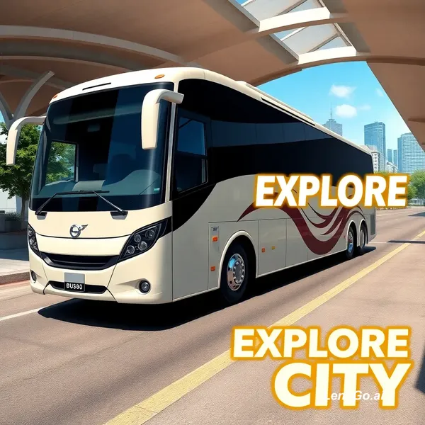 Ultra realistic YouTube gaming thumbnail of a Volvo 9600 luxury bus with elegant cream white body color and dark black front glass design, stylish brown wave graphics on the sides, premium modern coach look, parked in a large open city terminal, bright sunny daylight, realistic shadows and reflections, highly detailed BUSSID gameplay graphics, smooth realistic road texture, cinematic camera angle from front side view, ultra HD quality, realistic environment with green trees and modern buildings in background, detailed bus headlights and mirrors, realistic game interface slightly visible, vibrant and sharp colors, professional gaming thumbnail composition. On the right side add large bold text: "EXPLORE CITY" in glowing yellow and white modern font with black outline and shadow effect, eye-catching YouTube thumbnail style, dramatic lighting, high contrast, ultra detailed, realistic graphics, 4K quality, trending gaming thumbnail, 16:9 aspect ratio.