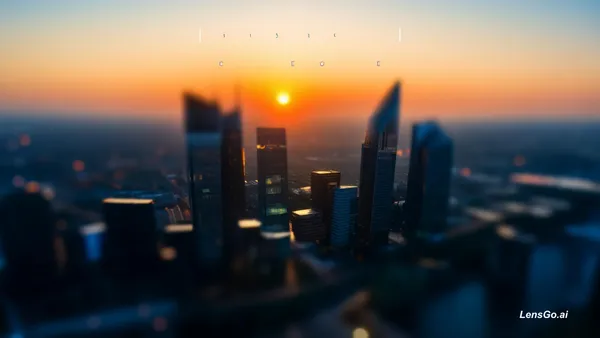 AI Image: Smooth aerial drone shot flying over a modern cityscape at sunset, reflections on glass buildings, c