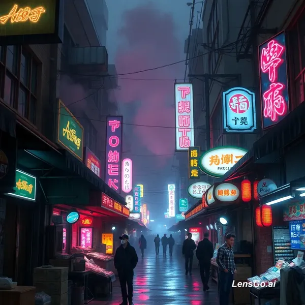 AI Image: Cyberpunk street market in the rain, neon signs and steam rising