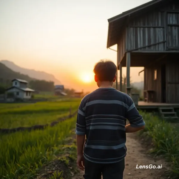create an image of boy with older adult leaving the village from Gamo highland to city, the village with green field, local house and on front of them there is sunrise, the image should be from back of the village