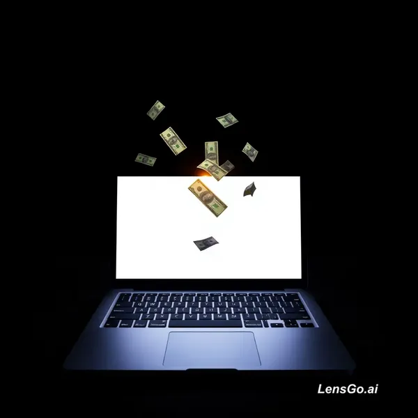 “Dark modern Instagram post, digital business theme, laptop with glowing screen, money floating, success concept, high contrast lighting, minimal design, cinematic, black background, professional marketing style”