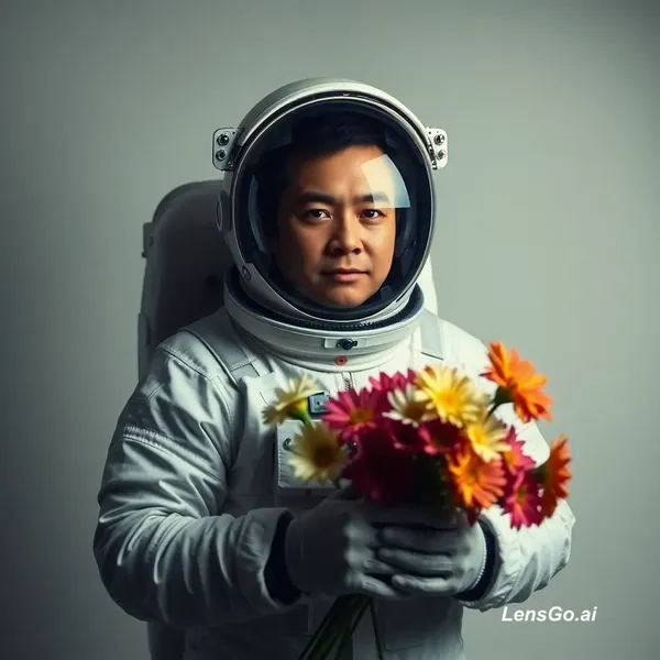 AI Image: Studio portrait of an astronaut holding flowers, dramatic lighting