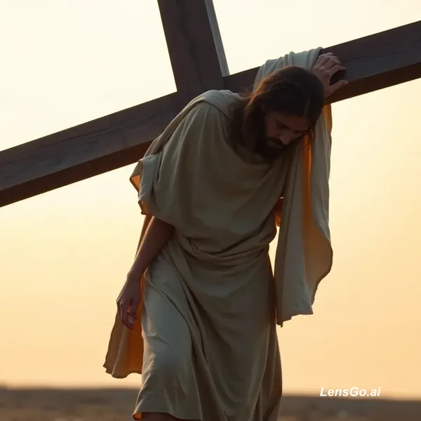 AI Image: "A full-body, cinematic depiction of Jesus Christ carrying a massive wooden cross on His back, walki