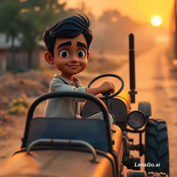“3D cartoon style, Rohit Jhinjurki as a young Indian boy with simple clothes, slim body, medium brown skin, short black hair, confident eyes, driving an old tractor in a rural area, dusty road, sunset lighting, emotional inspirational mood, cinematic view, village to city journey vibe”
