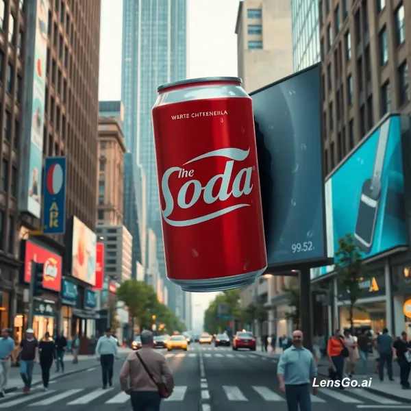 AI Image: A massive 3D soda can popping out from a billboard in the middle of a city street with people. ultra