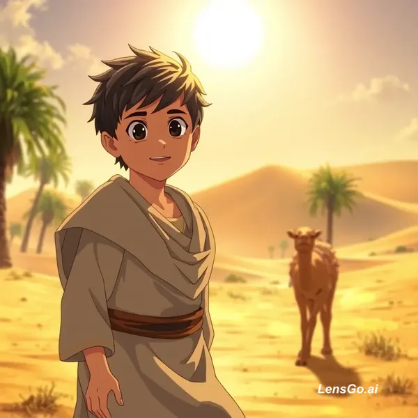 "A young Khalid ibn al-Walid as a child, playing in a sunlit desert village, wearing traditional 6th-century Arabian clothes, curious and brave expression, small camel nearby, palm trees and sand dunes in the background, soft warm lighting, cinematic anime style, detailed facial expressions, gentle breeze moving clothes and hair, cinematic camera angles, high-quality anime illustration, emotional and inspiring atmosphere."
