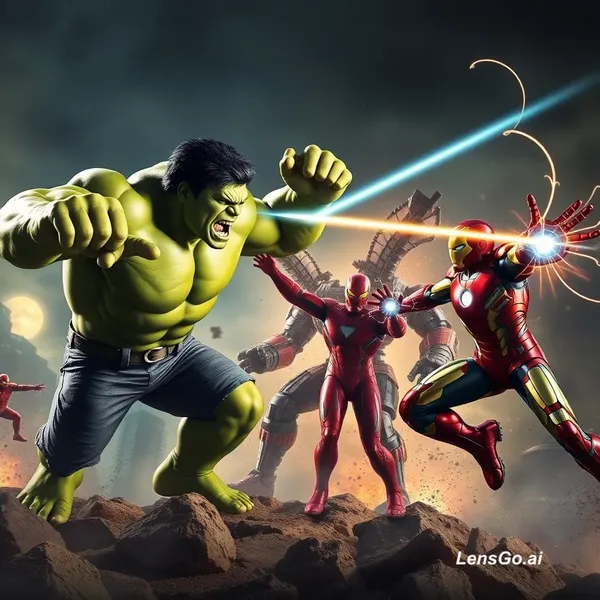 AI Image: epic battle scene, Hulk punching monster, Iron Man shooting laser, Spider-Man shooting web, cinemati