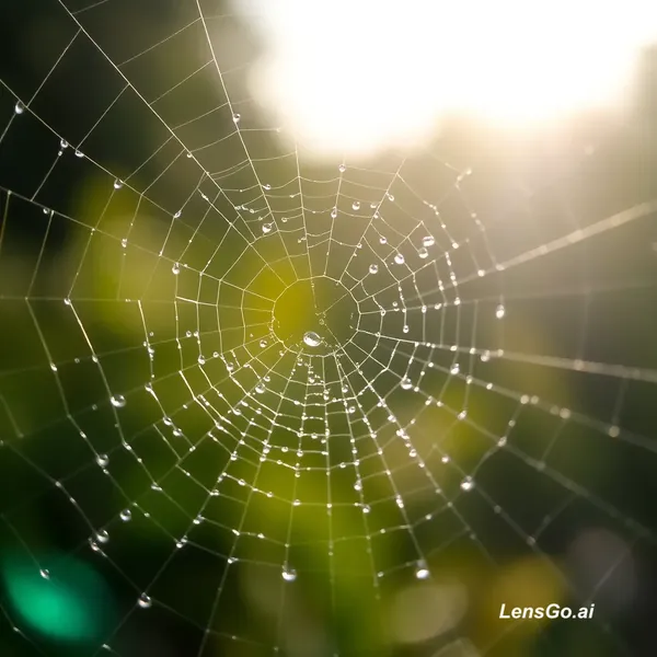 AI Image: Macro photograph of morning dew on spider web, bokeh background