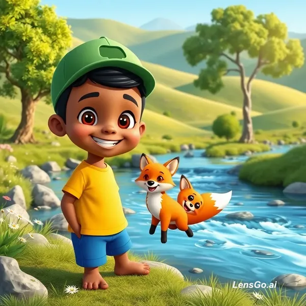 A high-quality 3D cartoon style illustration of a young Somali boy named Hirsi playing with his fox best friend near a clear flowing river. Hirsi has warm brown skin, big expressive eyes, short black hair, wearing a green cap, yellow t-shirt and blue shorts, barefoot and smiling happily. The fox is small, fluffy, bright orange with white chest and tail tip, playful and friendly. They are in a beautiful green landscape with trees, flowers, rocks, and soft sunlight. Background includes rolling hills.