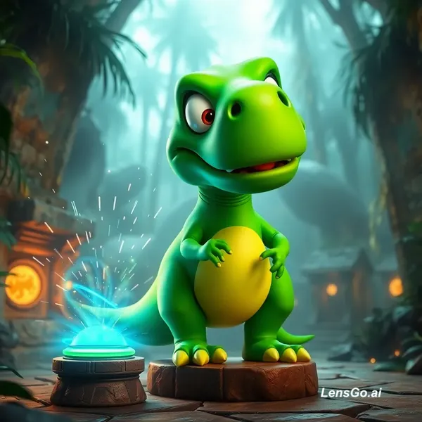 The Shrinking Moment (Hook) Prompt: A funny-looking bright green cartoon T-Rex named Rex, with smooth vibrant green scales, lighter green belly, big round expressive eyes, slightly oversized head, tiny arms, thick tail, and a goofy playful face, a talkative and highly expressive character mid-speech, standing inside a dense jungle laboratory filled with mysterious glowing elements and ancient stone technology, Rex pressing a glowing futuristic button on a small stone pedestal, the button emitting intense neon blue and green light, magical energy explosion radiating outward, shockwave of light particles and energy rings expanding, Rex beginning to shrink rapidly with magical distortion effect, his face showing extreme shock and humor as if shouting, glowing particles swirling around him, jungle trees towering in the background, cinematic fog, volumetric light beams, motion blur, dramatic lighting, depth of field focusing on Rex's face, vibrant Pixar-style animation, ultra-detailed textures, whimsical and funny tone, Ultra-detailed 10K cinematic animation, Pixar-style 3D, volumetric lighting, depth of field, ultra-sharp focus, dramatic shadows, global illumination, highly detailed textures, soft cinematic glow, dynamic camera angles, shallow depth of field, expressive character, 8k-10k resolution, high contrast, cinematic storytelling, hyper-realistic environment, no text, no watermark