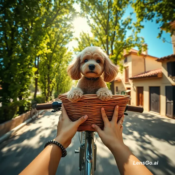 Wide-angle first-person view, hands of a young woman holding a bicycle handlebar, a wicker basket attached to the bike with a toy poodle inside. The dog's curly fur flutters softly in the breeze, head slightly raised, eyes squinting from the wind, with a cheerful and elegant expression. The bicycle rides along a narrow stone-paved road through an archway of tall green trees, sunlight filtering through the leaves, creating moving spots of light and shadow on the road and hands. Italian village details in the background: terracotta roofs, balconies with flowers, wooden shutters. Clear sunny day with a deep sky gradient from rich blue above to lighter near the horizon, sense of endless road perspective, calm warm atmosphere, gentle wind motion.