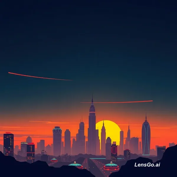 AI Image: Art deco poster of a futuristic city skyline at sunset